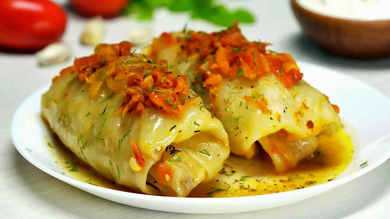 Кочан капусты (с удаленной кочерыгой) отваривают в подсоленной воде до полуготовности, разбирают на отдельные листья, утолщенные части листьев слегка отбивают. На подготовленные листья капусты кладут фарш, завертывают в виде конверта. Голубцы укладывают на противень или сковороду, обжаривают, заливают сметанным соусом.