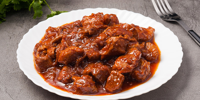 Нарезанное кубиками по 20—30 г и обжаренное мясо заливают бульоном или водой и тушат с добавлением пассерованной томатной пастой в закрытой посуде около часа.