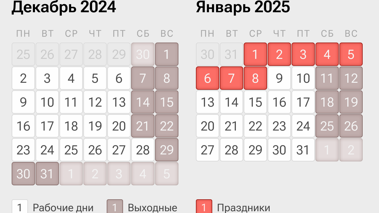 Январь является самым коротким рабочим месяцем в году. Согласно производственному календарю, в январе 2025 года всего 31 день, из них при пятидневной рабочей неделе будет 17 рабочих и 14 выходных. Первая рабочая неделя 2025 года — сокращенная, так как начнется со четверга 9 января.