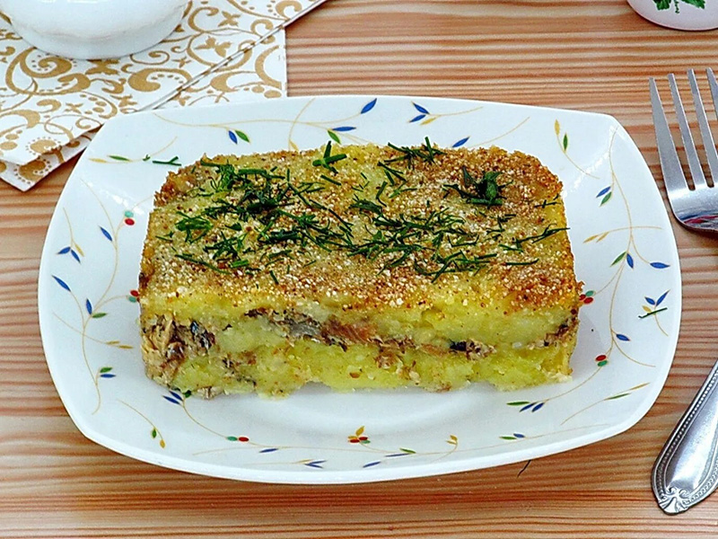 Готовят картофельное пюре, половину его кладут слоем 1,5—2 см на смазанную жиром и посыпанную сухарями сковороду, сверху укладывают подготовленные рыбные консервы, покрывают слоем оставшегося картофельного пюре. Поверхность выравнивают ножом. Запеканку посыпают сухарями, сбрызгивают растопленным маслом и запекают 5—10 мин.