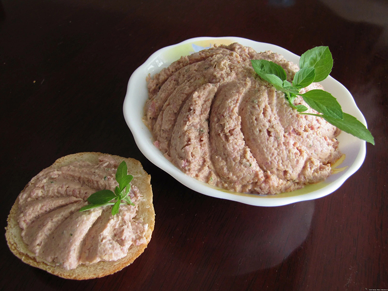 Нарезанные лук, морковь поджаривают со шпиком до полуготовности, добавляют нарезанную печень, специи, все жарят и пропускают два раза через мясорубку с частой решеткой, добавляют 70 г размягченного сливочного масла, молоко или бульон и тщательно вымешивают. Формуют в виде батона и оформляют маслом и рубленым яйцом. Вместо масла сливочного для паштета можно использовать куриный, утиный или гусиный жир.