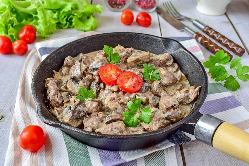 Подготовленную печень нарезают брусочками и обжаривают. Подготовленные свежие грибы нарезают ломтиками и обжаривают на масле сливочном или маргарине вместе с репчатым луком, нарезанным полукольцами. Подготовленные печень, грибы и лук кладут в горшочек, заливают процеженным грибным отваром, добавляют сметану и тушат до готовности.