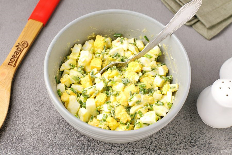 Яйца сварить вкрутую, сваренные вкрутую яйца рубят, смешивают с шинкованным луком, солят и заправляют сливочным маслом. Рубленые яйца с маслом и луком можно использовать для бутербродов.