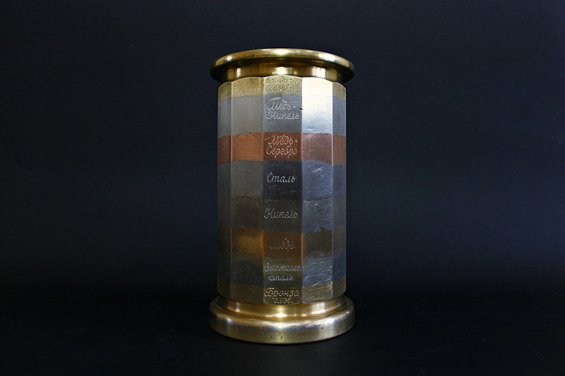 Это скорее не стакан, а некая трубка с запаянными с двух сторон круглыми пластинами. На дне «стакана» написано: «Экспонат на Всемирную электро-техническую выставку в г. Чикаго (Америка) изготовлен Н. Г. Славяновым 1893 год. Еще один «стакан» есть в Санкт-Петербурге в музее Политеха. Этот экземпляр показали в 1892-м году на выставке в Петербурге.