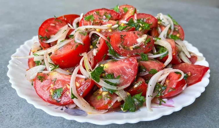 Яблоки с удаленными семенами, помидоры, огурцы нарезают небольшими ломтиками, сырые морковь и сельдерей — тонкой соломкой. У вишни удаляют косточку. В крупной чашке нарезанные плоды и овощи смешивают с зеленым горошком, заправляют соком лимона, сахаром и сметаной, салат перемешивают столовой ложкой и подают на стол.