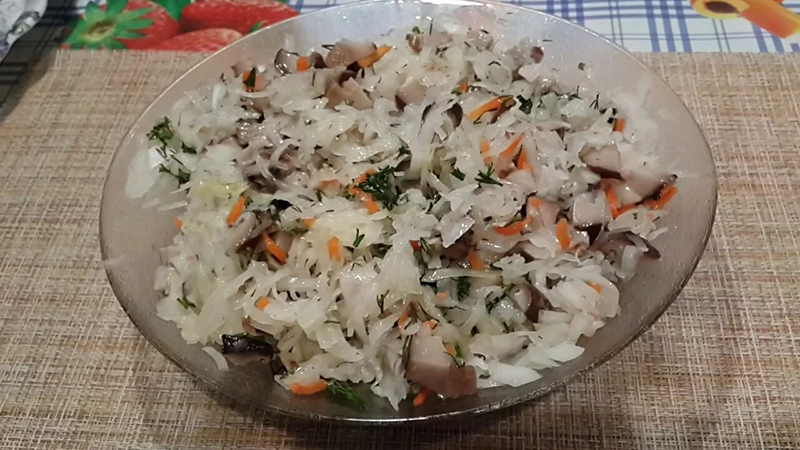 Подготовленные грибы варят до готовности, охлаждают, нарезают соломкой. Лук репчатый шинкуют, пассеруют на растительном масле, добавляют вареные грибы и жарят вместе с луком еще 10—15 мин. Капусту соединяют с пассерованным луком и грибами, добавляют лимонный сок, сахар, перец черный молотый и перемешивают.