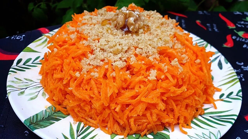 Очищенную морковь нарезают соломкой. Орехи очищают от скорлупы, измельчают и обжаривают. Подготовленные морковь, орехи соединяют с медом и клюквенным соком, перемешивают. При подаче на стол салат можно оформить целыми ягодами клюквы, посыпать рублеными орехами.