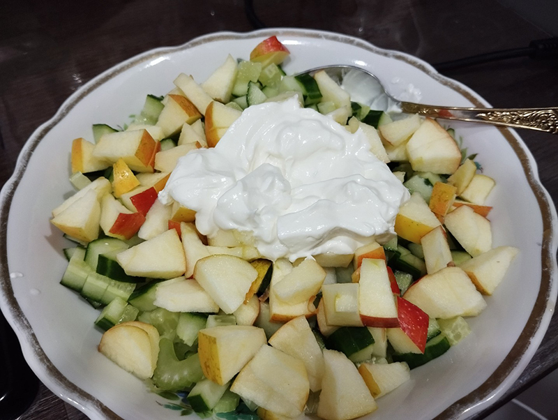 Продукты можно разложить слоями по фужерам или бокалам, поливают майонезом или заправкой, украшают ломтиками яблок и огурцами. Можно посыпать мелко нарезанной зеленью.