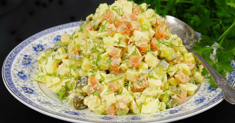 Редьку и морковь почистить. Картофель отварить. Из яблок вырезать семенное гнездои очистить от кожицы. Подготовленный лук, редьку, морковь, вареный очищенный картофель, яблоки, нарезать соломкой, Капусту шинкуют, посыпают солью и перетирают. Подготовленные овощи и яблоки соединяют, перемешивают и заправляют майонезом. Салат укладывают горкой, украшают ломтиками моркови, яблок и зеленью петрушки.