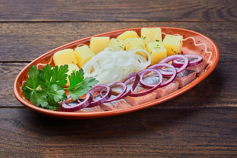 Филе сельди (мякоть) нарезают тонкими кусочками. Картофель к сельди отваривают и подают горячим, политым растительным маслом, или с кусочком сливочного масла.