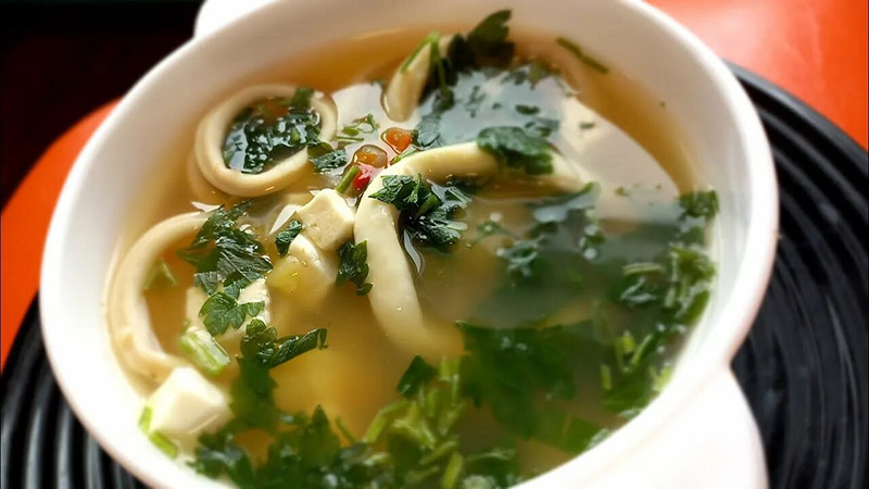 Вареные кальмары, сельдерей, лук, морковь нарезают соломкой, картофель — ломтиками. В кипящий бульон, полученный от варки кальмаров, кладут картофель, доводят до кипения, добавляют сельдерей, пассерованные лук и морковь. В конце варки кладут соль, специи.