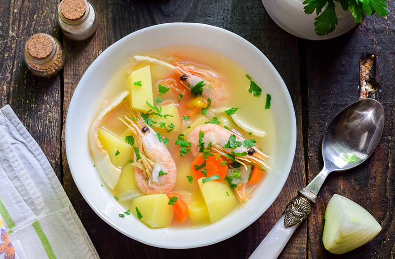 Грибы перебирают, варят и шинкуют. Грибной отвар процеживают. В кипящий отвар кладут отварные грибы, пассерованные нарезанные соломкой морковь и лук, цветную капусту, разобранную на соцветия, и варят при слабом кипении. В конце варки кладут зеленый горошек, мякоть креветок, специи.