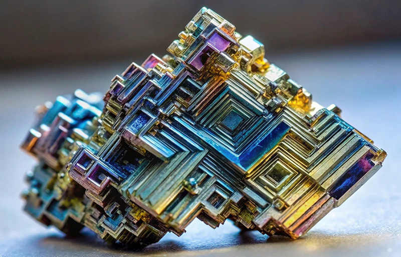 Цвет кристаллического висмута серебристый с розовым отливом. При нагреве поверхность покрывается радужной плёнкой, как у мыльного пузыря. Кристаллы висмута растут ступенчатой лестницей и вместо плотного кубика формируется каркас из ступеней.
